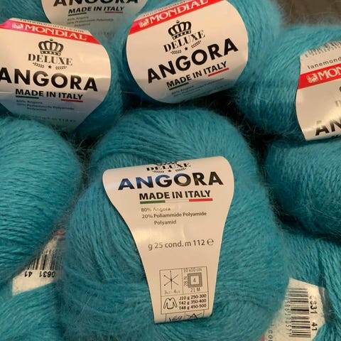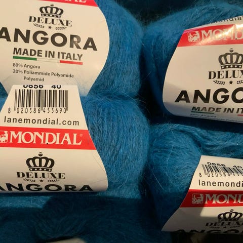 Mondial Deluxe Angora . Garnet består av 80 % angora og 20 % polyamid. Fargen er blå. Anbefalt pinnestørrelse er 3 1/2 til 4 1/2 mm, med strikkefasthet på 21 masker per 10 x 10 cm.