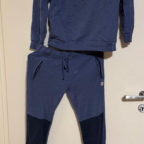 Nydelig og myk merinoull, i en herlig blåfarge - 100 % merinoull. Brukt svært lite, flotte detaljer på buksen med hvitt felt i siden og pen snøring.