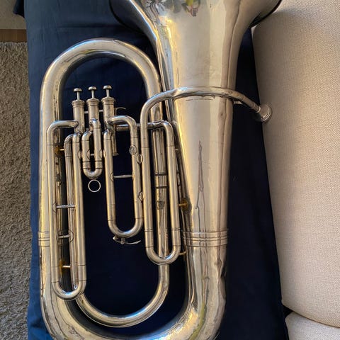 Dennis Wick mute til tuba. Modell DW5518 straight mute. Pent brukt, men da den er stor og i aluminium har den fått noen små bulker. Dette er ikke noe som påvirker funksjonaliteten.