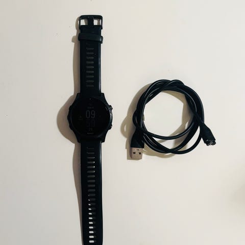 Garmin Forerunner 945 GPS-klokke med blå reim. Klokken har digital skjerm og pulsmåler på baksiden. Klokka har nå vært brukt i 7 år, og batteritiden er fortsatt veldig god. Etter så mange år er klokka naturligvis relativt slitt, derfor lav pris.