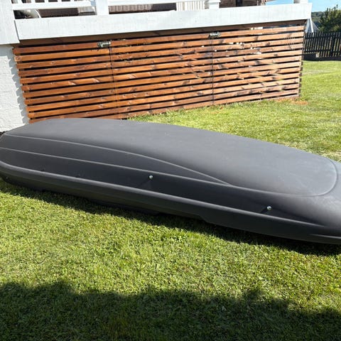 Thule Skigrip 850 takboks med tilhørende monteringsutstyr. Takboksen er svart og laget for oppbevaring av skiutstyr på bilens tak. Inkluderer fire festeklips og nødvendige skinner for montering.
