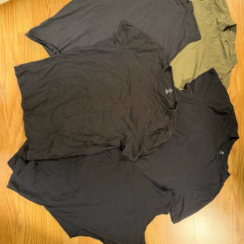 8 T-Shorter i str L. Hvit, blå og grønn.