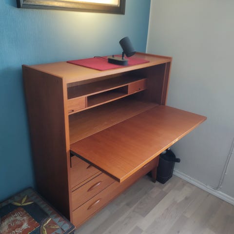 Skatoll i teak med buet topp som kan åpnes. Uttrekkbar klaff for skriveflate, og flere små rom for oppbevaring. Har også flere større skuffer under skriveflaten. Passer til bruk som skrivebord eller oppbevaringsmøbel. Må hentes.