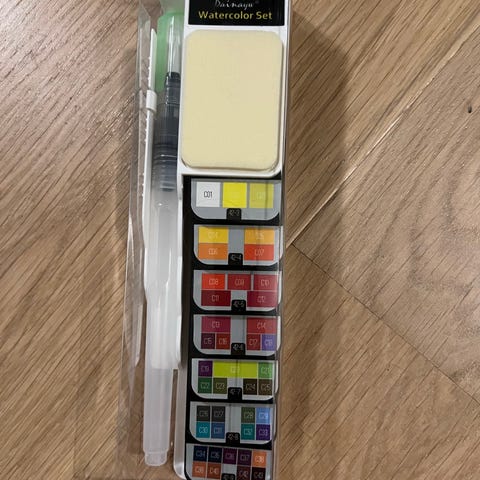 Amy tangerine Watercolor Set som inkluderer 12 akvarellfarger og en vannpensel. Egnet for kreativ maling og kunstprosjekter. Kompakt design som gjør den enkel å ta med.