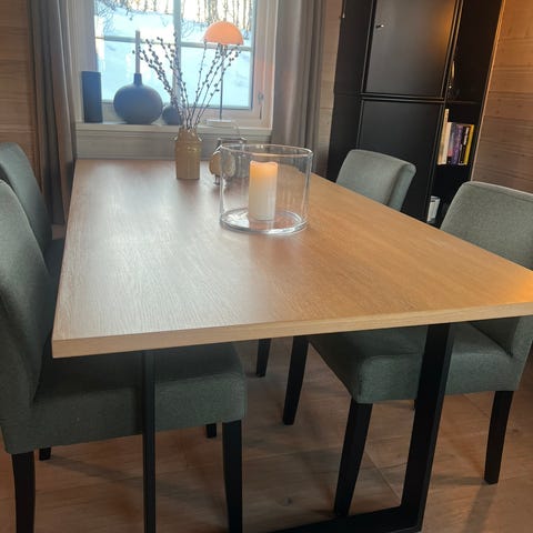 Svart spisebord ca. 7 år gammelt. Utslått måler bordet 2,70 m ellers 2,10 m. Bordet har slitasjemerker (se bilder), men er du ‘handy’ så kan det fikses. Kjøper må hente bordet selv.