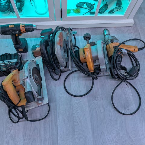 Stor verktøypakke (drill, sirkelsag, multikutter, stikksag, slipemaskin m.m)