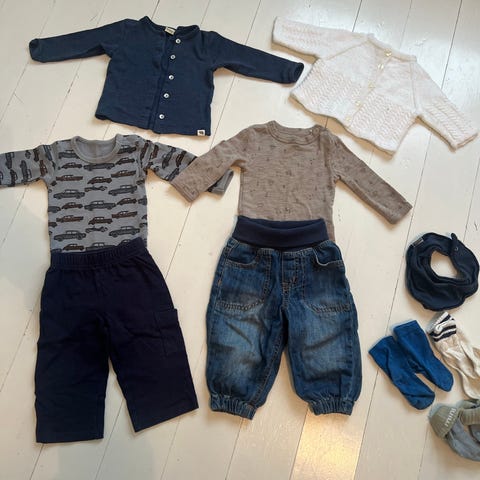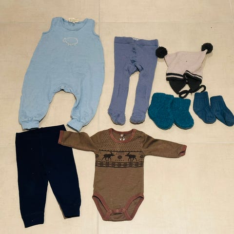 Selger pent brukt klespakke av ull i str 62. Passer fint til både gutt og jente.