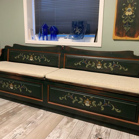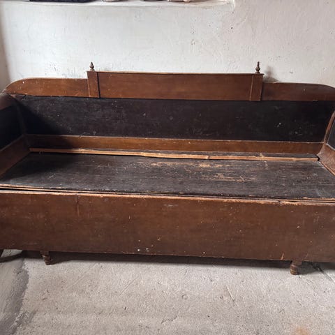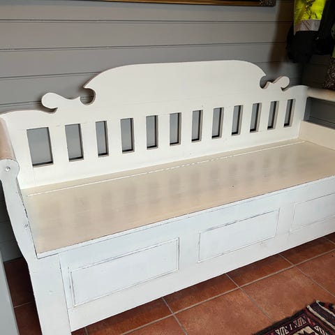 Hvitmalt furu slagbenk med stoffkledd sete og rygg. Rom under sete. Nedi rommet mangler det bunnplate, men det fungerer også fint uten denne.