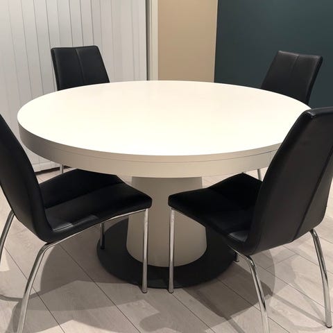 Bord og 6 stoler. I god stand. Flekk på bordplaten.