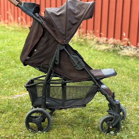 Petite Chérie barnevogn i svart farge. Barnevognen har fire hjul og et håndtak for styring.