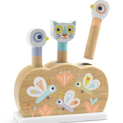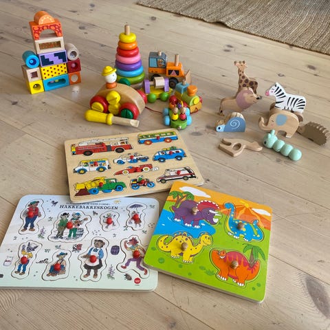 sorteringsboks i tre med forskjellige geometriske former og dyremotiver. Boksen har hull i ulike former for å matche trebitene. Inkluderer trefigurer med dyrehoder som kan trykkes ned. Leker i naturlige farger, laget av tre.