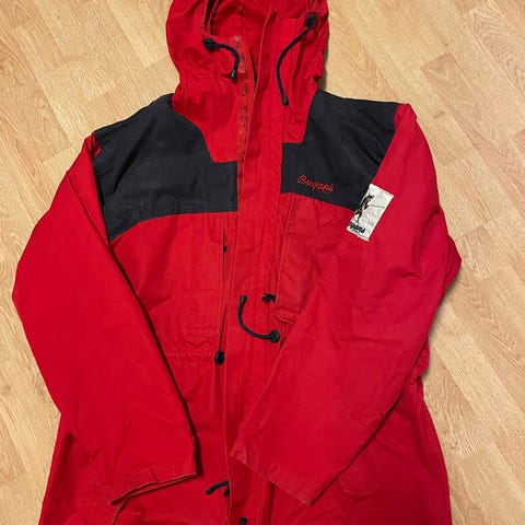 Bergans ekstremanorakk i bomull foret med dunlerret for ekstra vindtetthet. Toveis glidlås i front for fleksibel lufting. Ingen hull eller rifter. Små bruksmerker på skuldre etter ryggsekk. Romslig størrelse.
