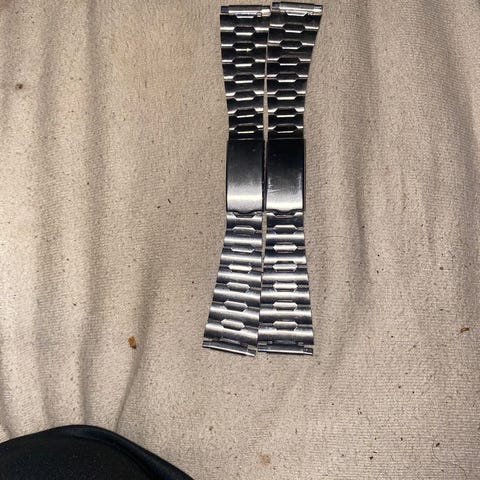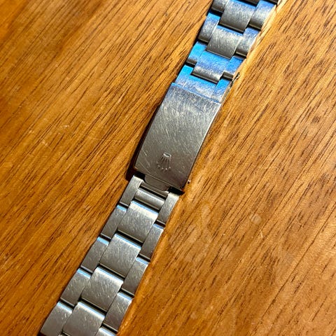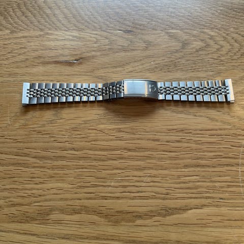 Omega strekk-lenke i rustfritt stål, trolig en Omega Speedmaster-lenke. Armbåndet har en lengde på omtrent 17,5 cm og en lukking med Omega-logo. Passer til Omega-klokker med kompatibel feste. Det står 516 på festene og 1039 bak på spennen.