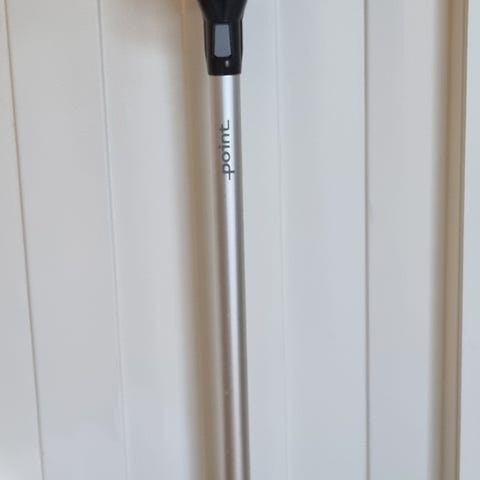 Point støvsuger med håndholdt enhet og oppladbart design. Enheten er svart og sølvfarget, egnet for rengjøring av ulike overflater i hjemmet.