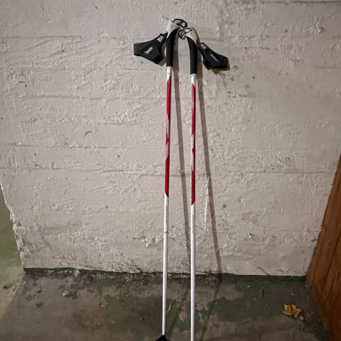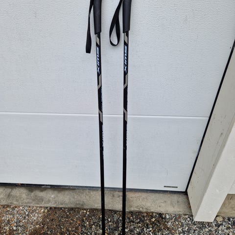 Swix langrennspinner med lengde på 120 cm. Staver er utstyrt med håndtak og stropper, designet for bruk ved langrenn. Farge: svart med hvite og blå detaljer.