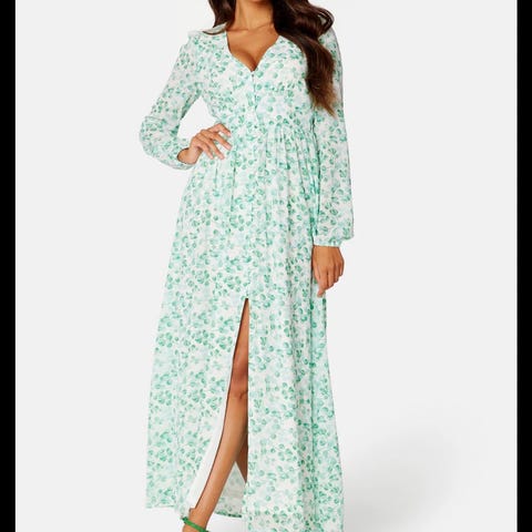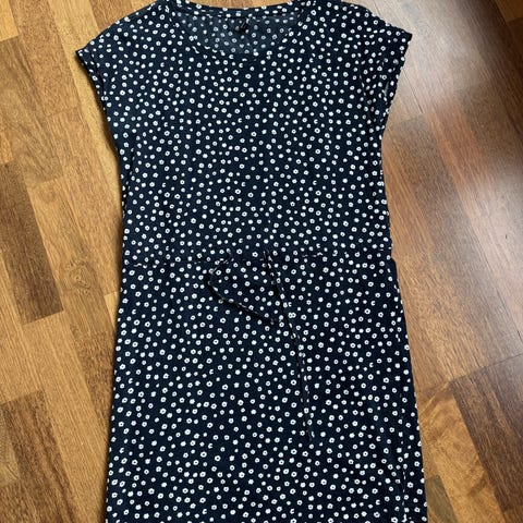 ONLY Sommerkjole i størrelse S. Kjolen har en blå basefarge med et mønster av blomster i ulike farger. Materialet er lett og egnet for sommerbruk.