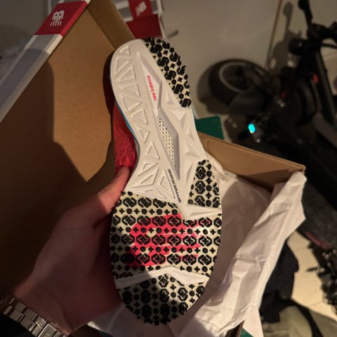 New Balance WMDS500P5 sneakers joggesko i størrelse 39. Skoene har en flerfarget design med blå, rosa og gule detaljer, og er utstyrt med pigger under sålen for bedre grep. Passer for bruk ved løping og andre aktiviteter som krever god feste og komfort.