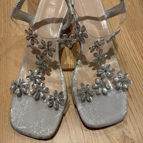 Steve Madden hæler i størrelse 39 i beige / gjennomsiktig farge. Skoene har en spiss tå og høy hæl, laget med delvis gjennomsiktig materiale, fine til både jeans og formelle anledninger. Kule til brudekjole! ❣️👰