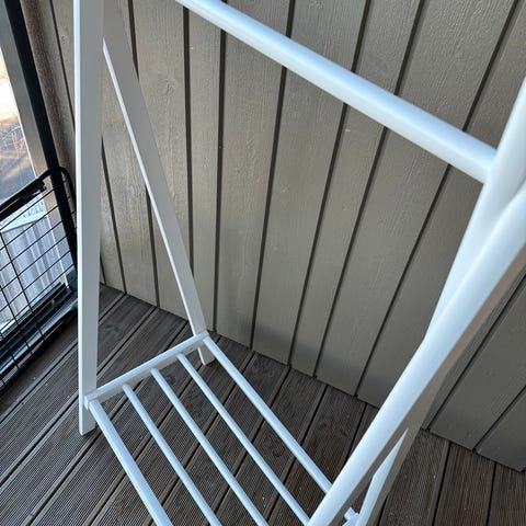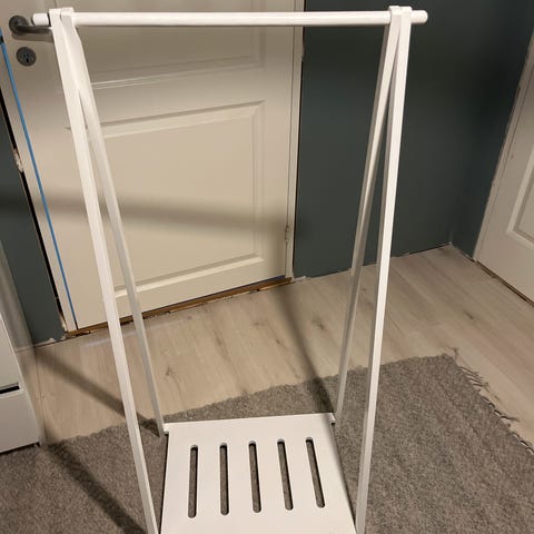 Hvitt klesstativ/kjolestativ i tre med skohylle nederst. Noen bruksmerker, se bilder.