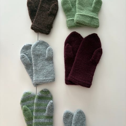 Hjemmestrikkede, tovede votter str. Medium selges.