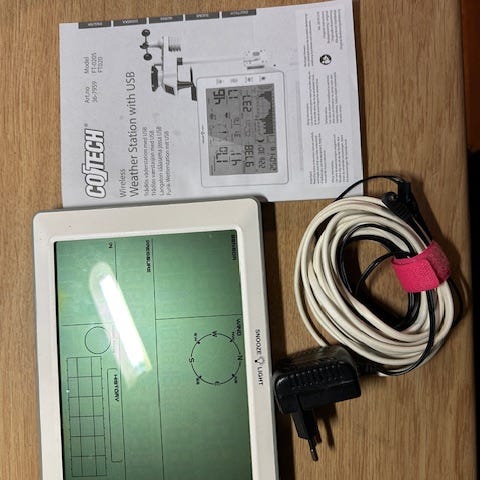 Termometer på batteri som er noe falma. Måler temperatur inne og ute (ledning som legges på utsiden gjennom en vinduskarm.