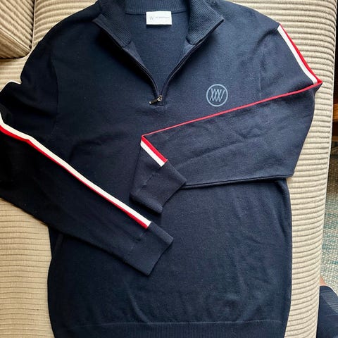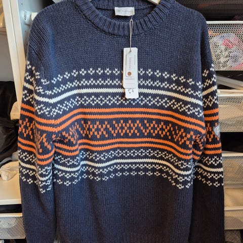 Wood Wood ullgenser i blå farge, størrelse M. Genseren er laget av ull og har et tradisjonelt mønster i hvitt. Passer til menn.