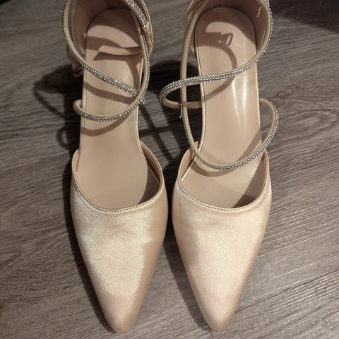 Fint brukte sko til brudekjole selges. De er i ivory satin. Størrelse 37. Kjøpt nye for 1500 kr, brukt en gang. Noen bruksmerker, se vedlagte bilder. Selges for 750 kr.