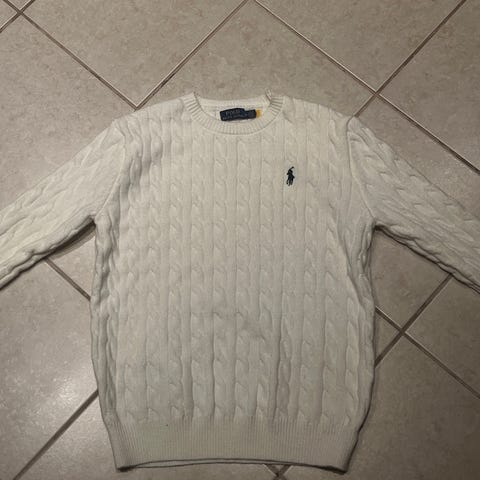 Ralph Lauren genser i bomull, størrelse S, i fargen hvit. Designet for herre, med et flettet mønster og rund hals. Og den passer folk som er 170-180 og 50-60kg
