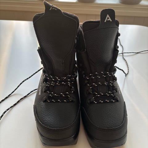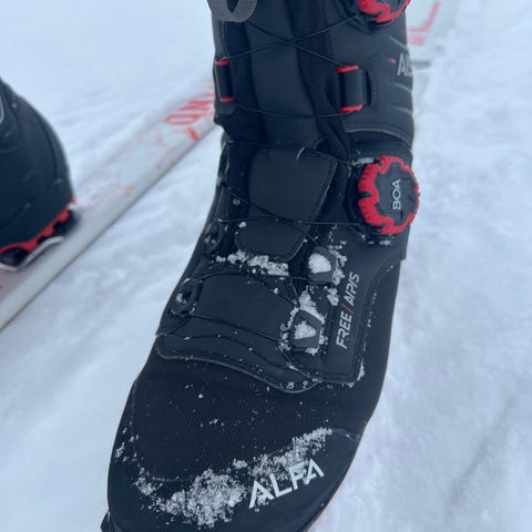 Alfa free herremodell i str 40. Skoene er brukt til både toppturer, dagsturer og fjellturer med ski og pulk. Brukt i en sesong av dame med bred lest. Det er antydning til begynnende slitasje på begge sko på utsiden framme ved tåballene, se bilder.