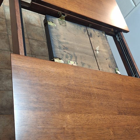 Veldig flott spisebord. Nydelig farge i treet. Det fremstår velholdt, har ingen tydelige skader. Det passer veldig godt dersom man ønsker et ikke for stort spisebord. Det har en praktisk ileggsplate på 20 cm som kan lagres i bordet. Bordet blir da 120x80. Vi har vært veldig fornøyd med dette bordet og skulle gjerne beholdt det. Men nå trenger vi et litt større bord.