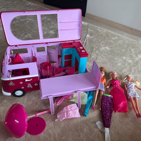 Barbiedukker i ulike modeller. 21 voksne, hvorav 4 menn, flere barn, to hester, liten bil, stellebord, leker osv.