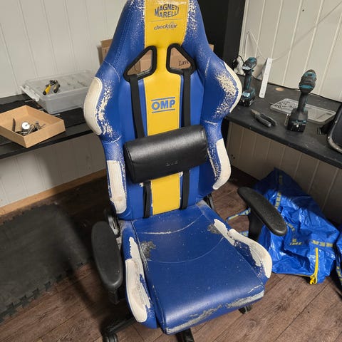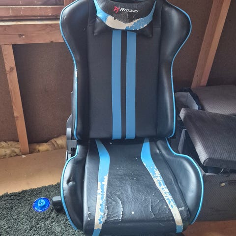 Arozzi gamingstol gis bort. Skinnet har falmet, ellers ingen feil på den utenom at hjulene står litt fast. Lille teppelappen på sete kan medfølges om ønskelig. Hentes på Libru.