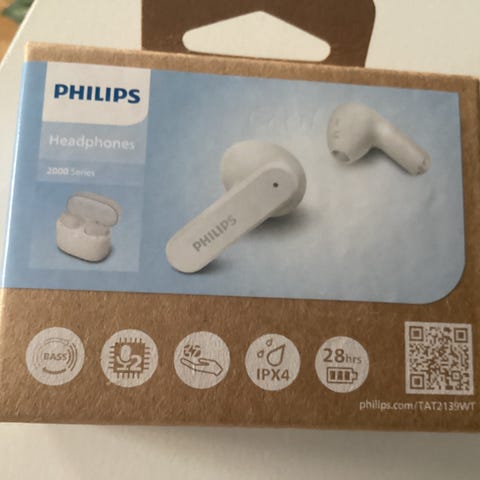 2 Philips 2000 Series True Wireless hodetelefoner med ladeetui. Trådløs tilkobling, lett og kompakt design. Inkluderer mikrofon for samtaler og automatisk paring med enheter. Batteritid opptil 6 timer med ekstra lading i etuiet.