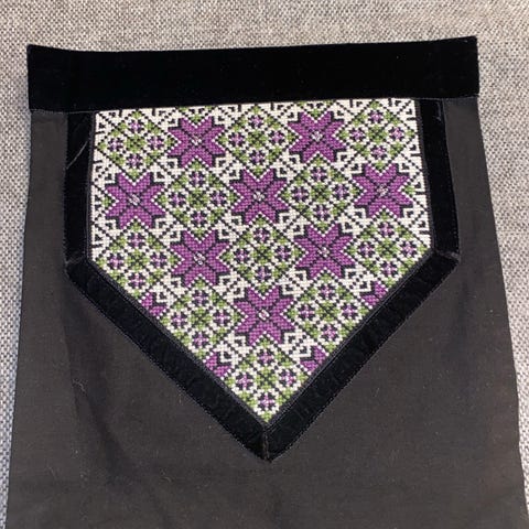 perlet bringeduk til Hardangerbunad. Perlet pynt på fløyelsbånd også.