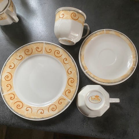 Kaffeservise / tallerkener / kopper i grei stand selges. 12 kopper, 12 store tallerkener og 11 små tallerkener.