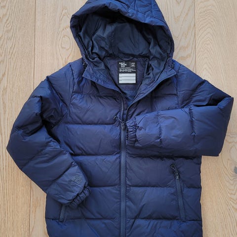 Pent brukt dunjakke selges. Jakken er mørk blå. Merket er Neomondo, og den er kjøpt på XXL.