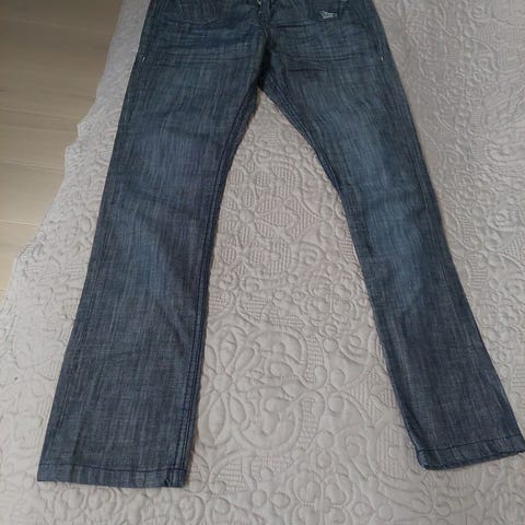 Gammel. Midjemål 90 cm, indre benlengde 80 cm. God stand, men har en skrape på høyre baklomme, se siste bilde
