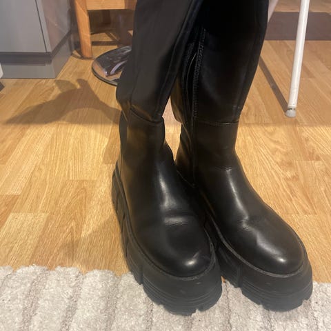 Zara støvler i størrelse 40, svart farge. Støvlene har en solid såle med godt grep og er laget for å dekke leggen. Passer til bruk i kaldere vær og gir god beskyttelse for føttene.