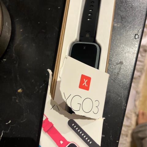 Xplora XGO3 smartklokke i svart farge. Klokken har et rektangulært display og leveres med ladekabel og ekstra tilbehør. Pent brukt i ca 18mnd av min datter.