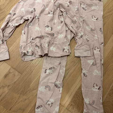 H&M pyjamas for jente i størrelse 8-10 år , laget av bomull. Pyjamasen har en rosa farge med mønster, og består av langermet topp og bukse.