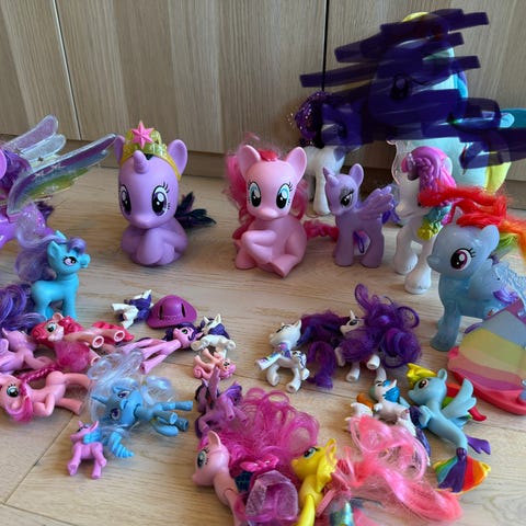 My Little Pony barneleker figurer i forskjellige farger og størrelser. Inkluderer flere ponni-figurer med ulike utseender og detaljer.