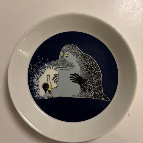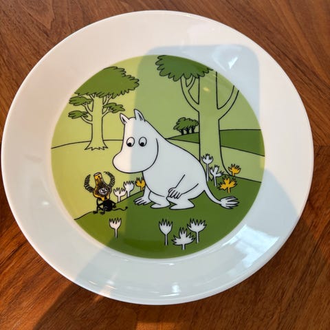 Veldig fin stand ser fortsatt ny ut. Arabia Mummitrollet tallerken asjett i designet Hemulen gul. som pli farger. Tallerkenen har et motiv fra Mummitrollet-serien og er laget av keramisk materiale.