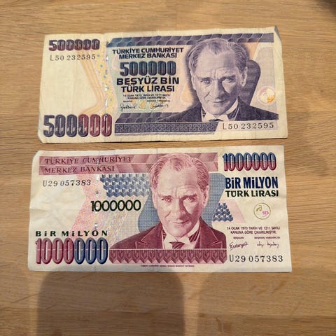 2×1000 000 tyrkiske lire sedler fra 1999.
