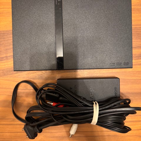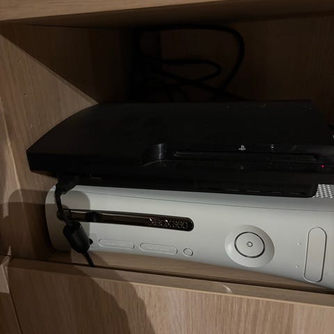 Microsoft Xbox 360 spillkonsoll med tilhørende bæreveske. Konsollen har standard design og inkluderer strømforsyning. Bærevesken er laget for å transportere konsollen og tilbehør.