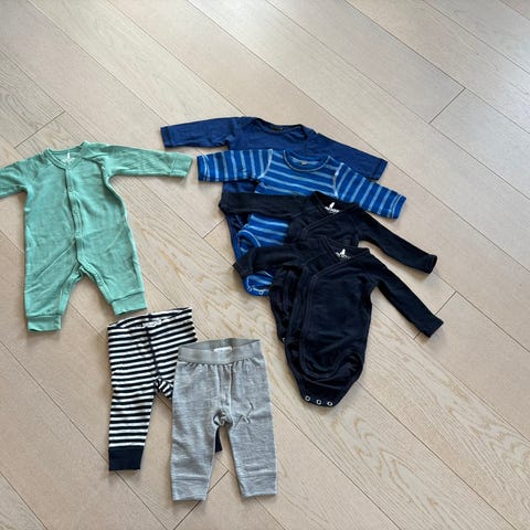 3 sett i reflex. Grønt sett har et bitte lite hull på rompa på body etter vask. Ingen rakning.