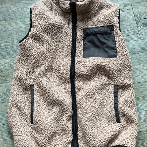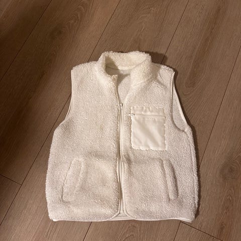 Selger en hvit vest I størrelse 134/140. Kjøpt på Lindex. Lite brukt, fremstår som ny. Glidelås i front.
