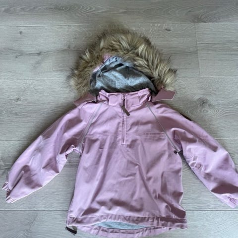 Pent brukt boblejakke fra Gullkorn i str 104. Ikke dun og med falsk pelskrage. Hette kan kneppes av. God og varm jakke brukt 1 sesong av datter som jakke nr 2, stort sett til "pent". Mansjetter på armene, de tetter godt. Ingen slitasje, men noen få svake merker, se bilde. Reparasjons lapp følger med.