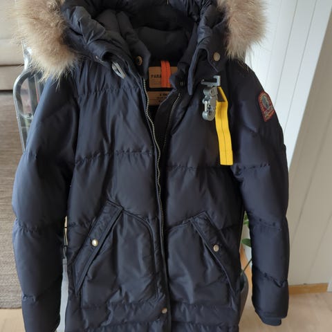 Parajumpers vinterjakke i størrelse XS for kvinner. Jakken er svart og laget av polyester. Den har hette med pelsdetalj og flere lommer, egnet for kaldt vær.