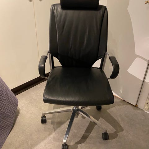 &Tradition kontorstoler designet av Alberto Meda. Stolene har justerbare armlener og ryggstøtte, med seter og rygg trukket i svart stoff. Egnet for bruk i kontormiljøer, med hjul for enkel bevegelse og ergonomisk design for støtte ved langvarig sitting.