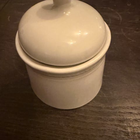 Selger en liten kopp med lokk og skje i hvitt porselen. Den er ikke av nyere dato, men uten noe stempel. Den er 7 cm høy uten lokk og 10 cm med lokket. Dette er en fin kopp å bruke